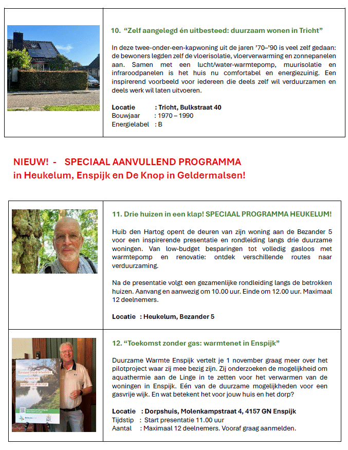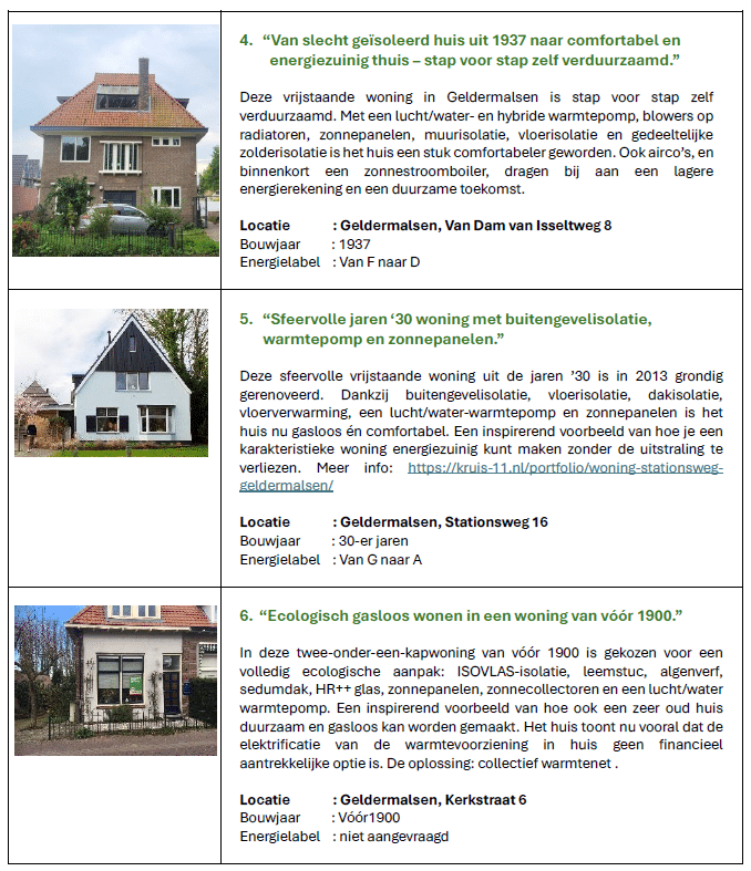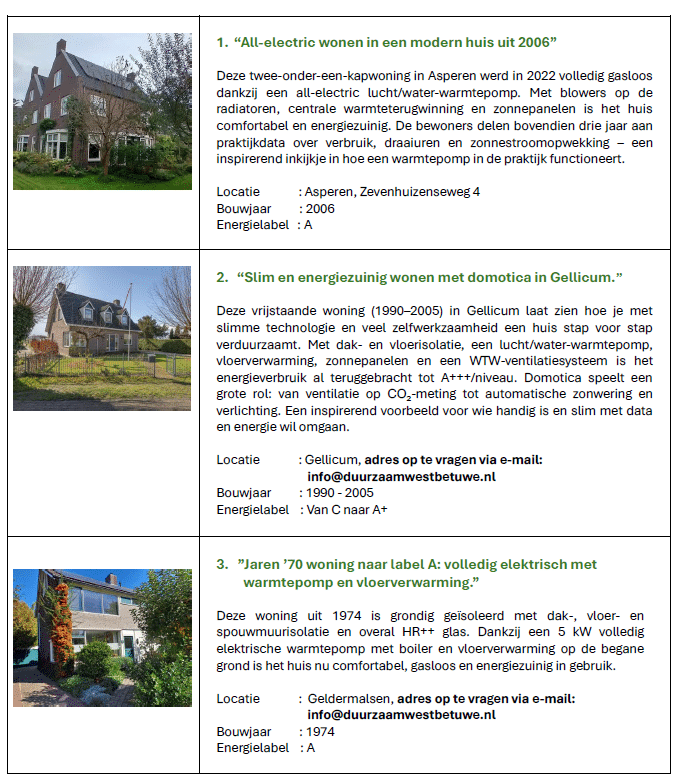 * Er staan 2 huizen op de lijst waarvan het adres op aanvraag is. Stuur hiervoor een mail naar marisca.stolp@duurzaamwestbetuwe.nl.